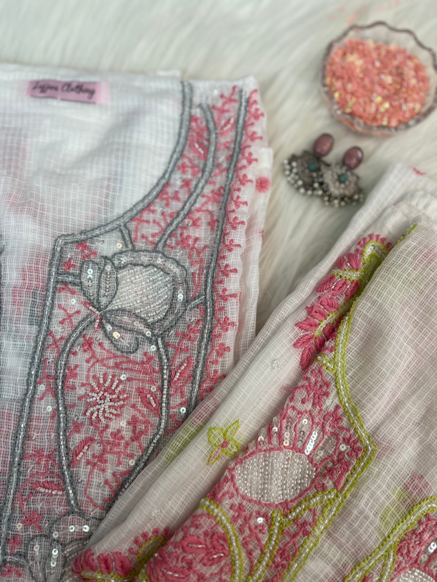 - Features intricate chikankari embroidery highlighted with beads, sequins, and delicate appliqué work